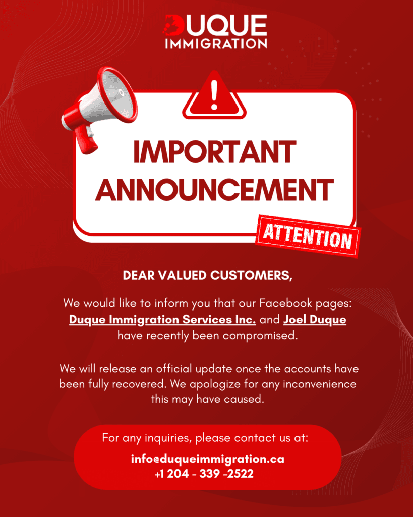 Please be advised that our official Facebook pages, Duque Immigration Services Inc. and Joel Duque, have recently been compromised. We are working diligently to recover these accounts and will provide an official update once they are secure.